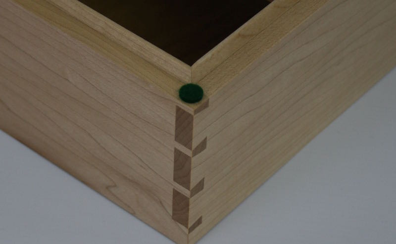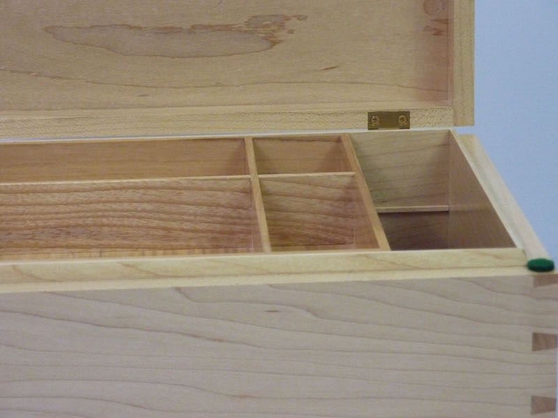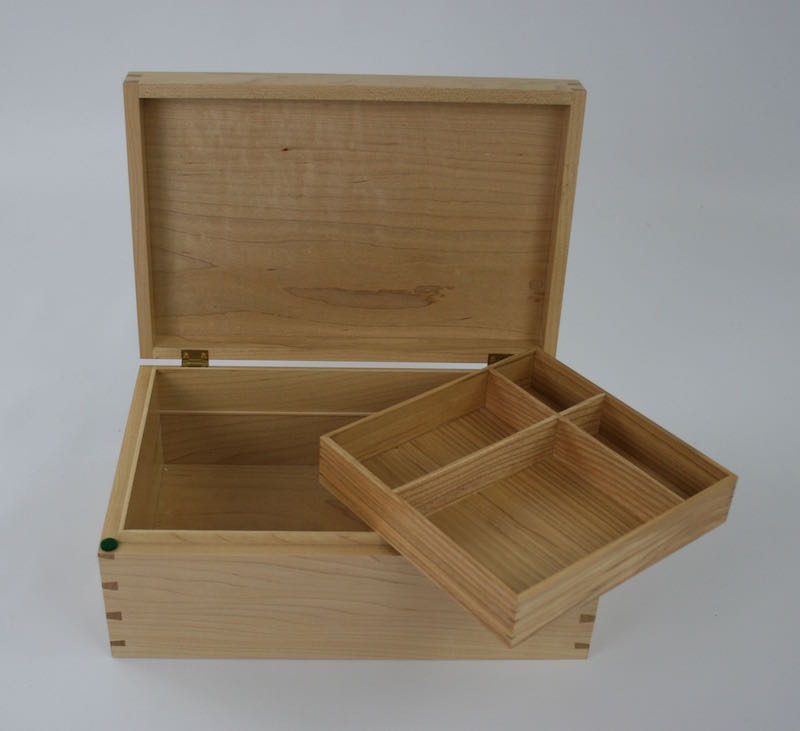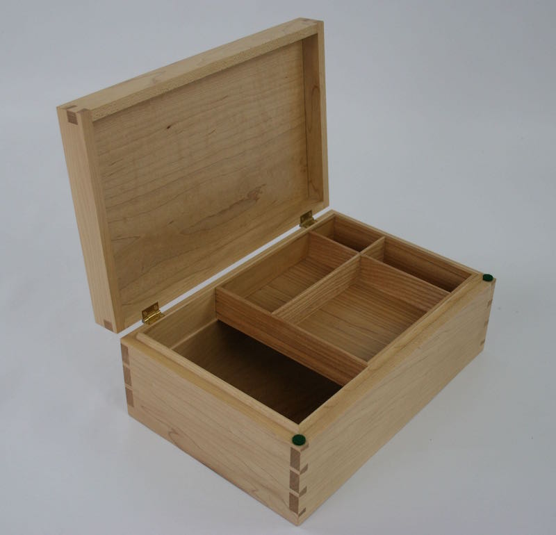 This Jewelry box in Maple has beautiful handcut dovetail corners and a sliding upper tray Click on the photos for a larger image
