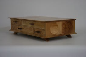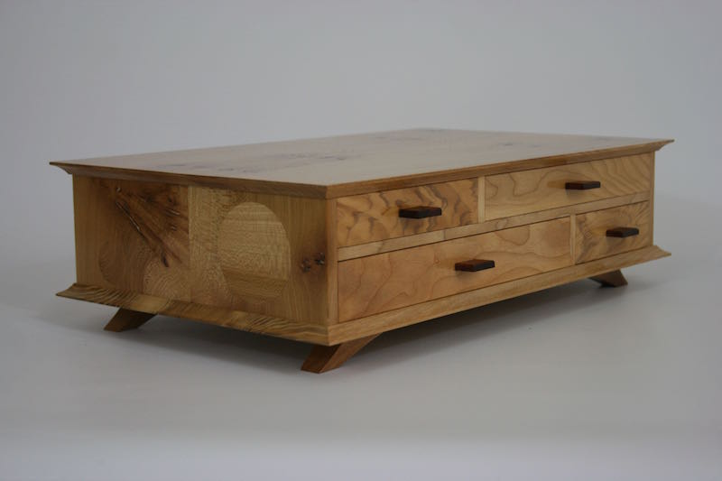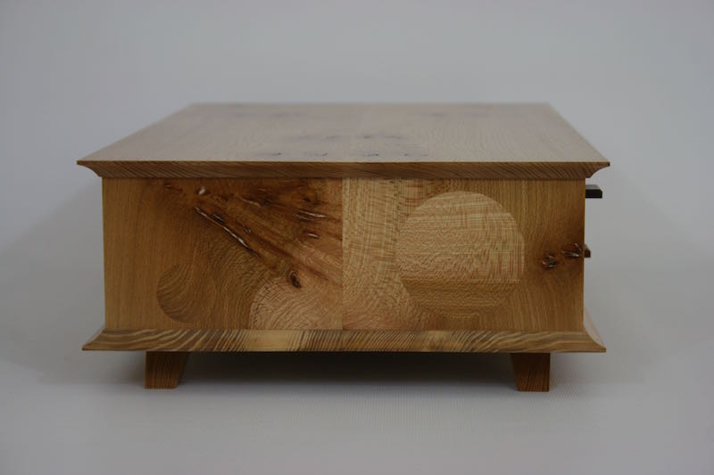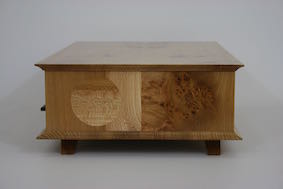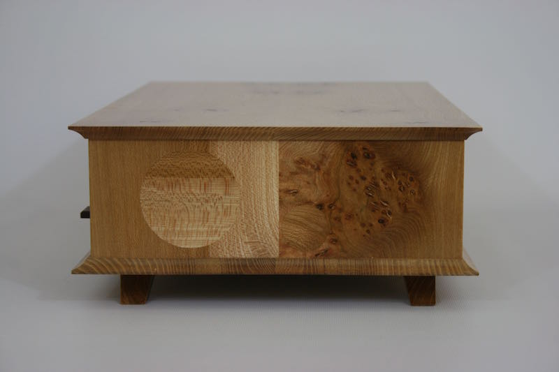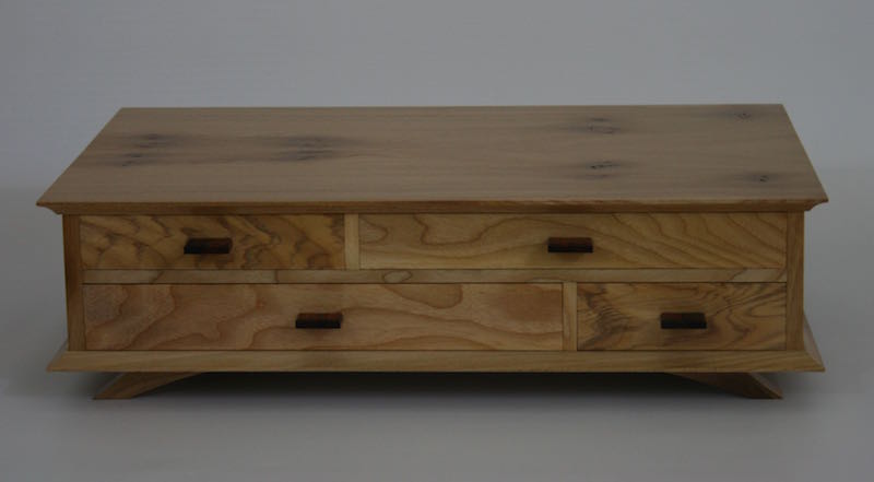 A desktop keepsake box in French polished Elm with contrasting Ash drawer fronts and Cedar drawer liners Subtle circular inlays in the sides add a little fun 420mm wide, 80mm high, 260 deep Click on the photos for a larger image